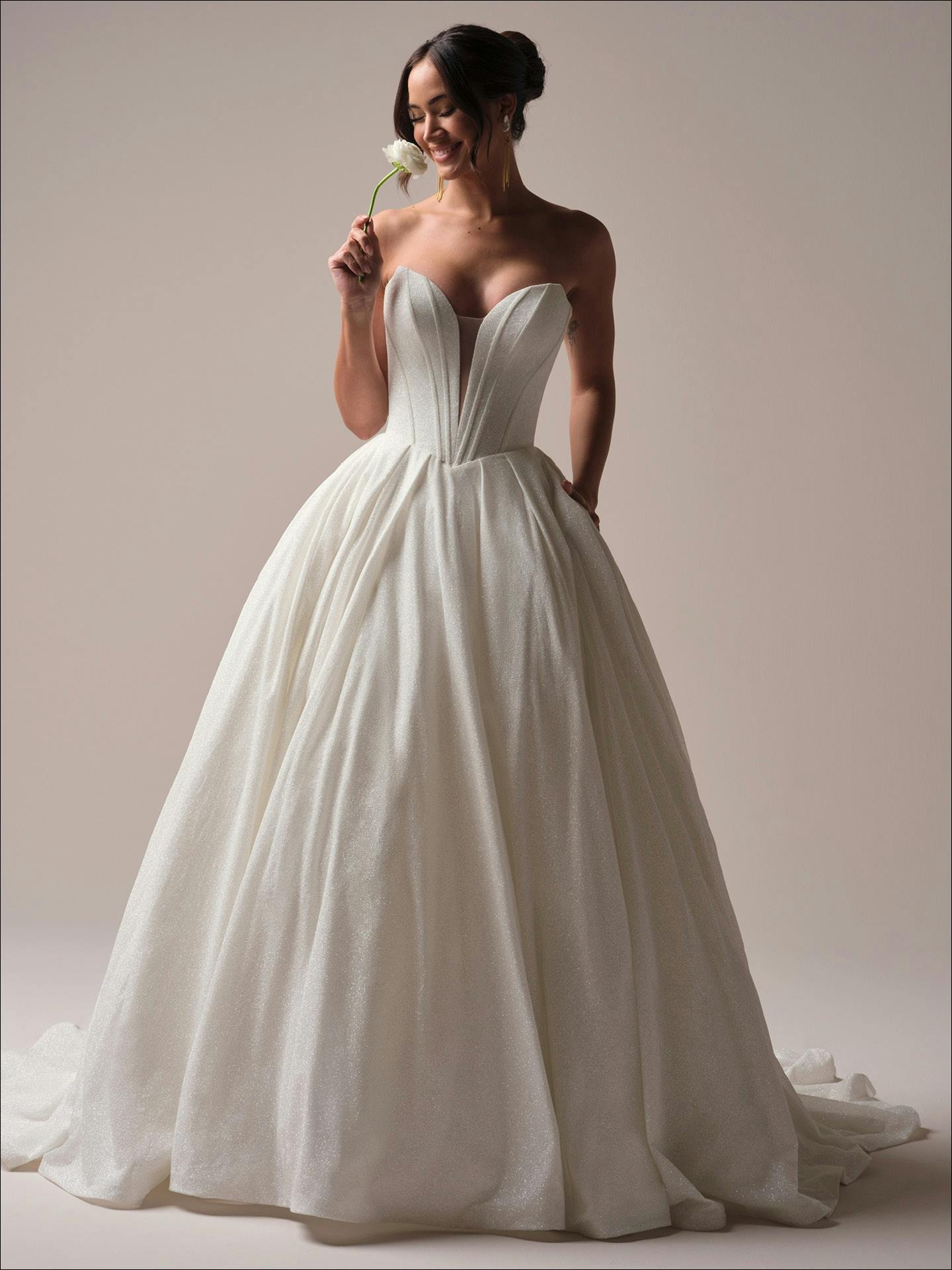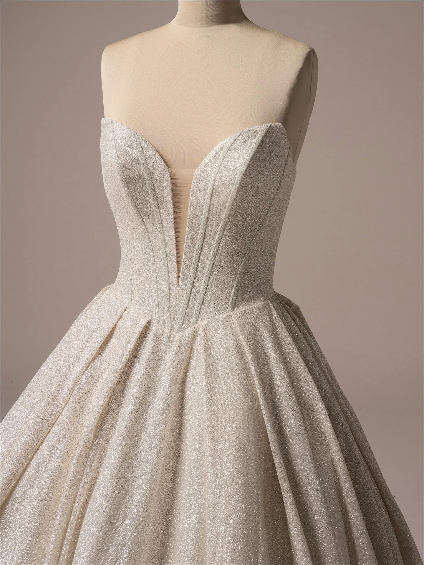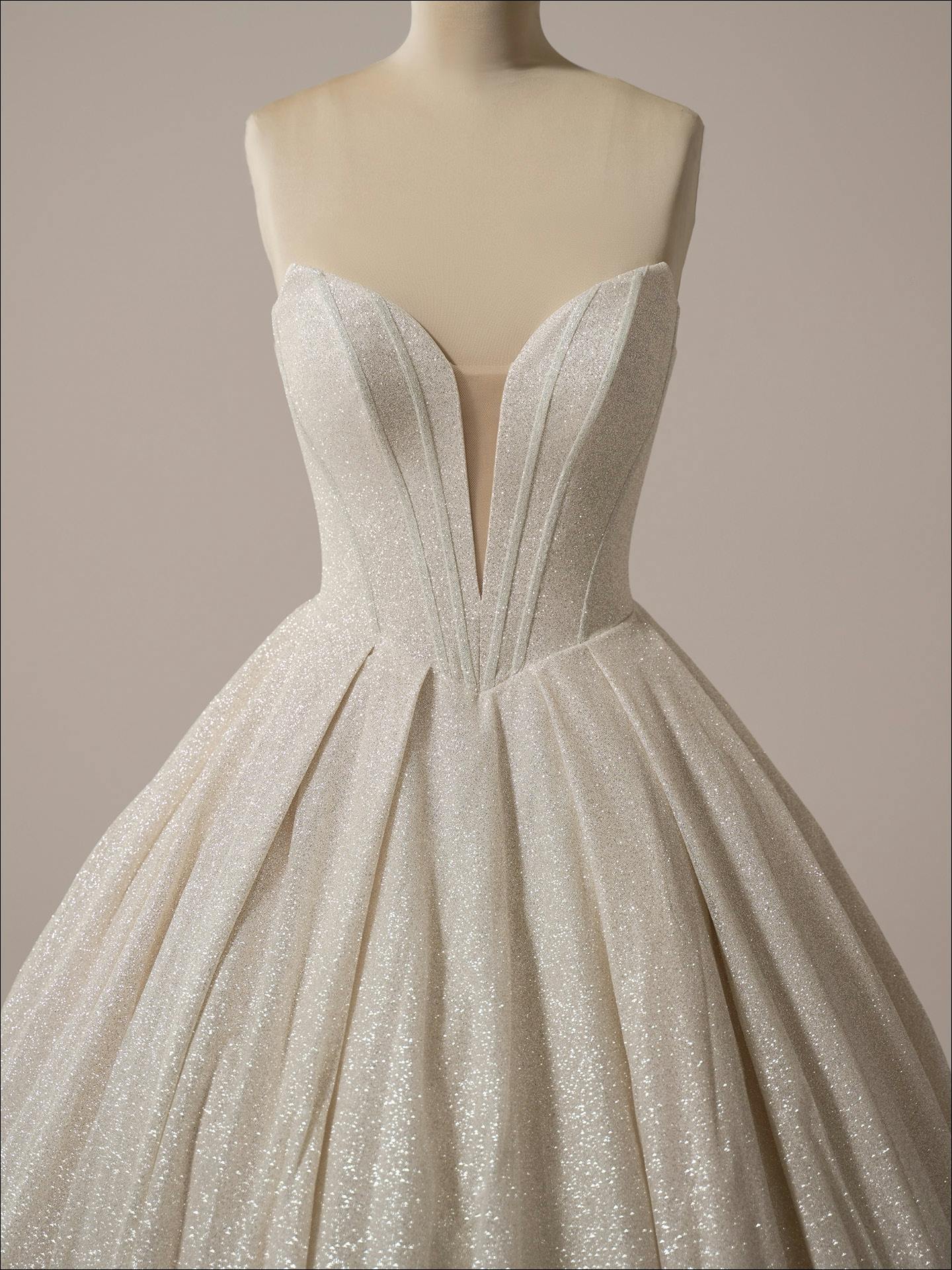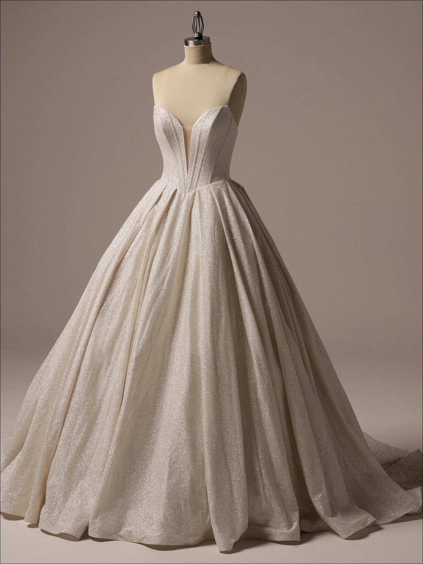 Regal-chic style starts with a princess silhouette and luxe fabric. This sparkly plunge neck ballgown wedding dress has both those bases covered — and more.