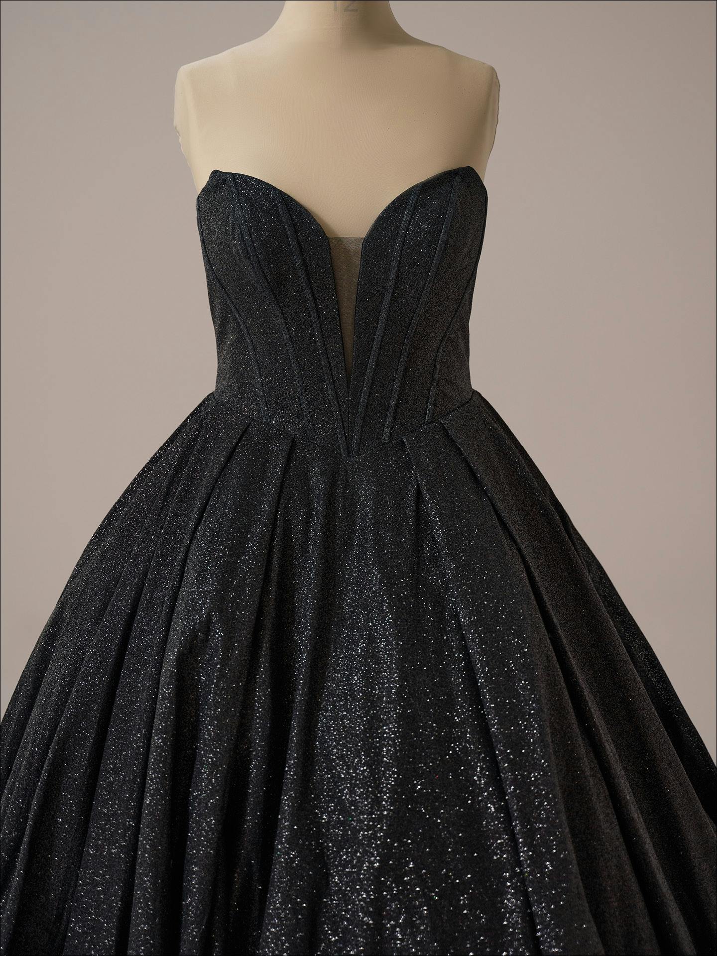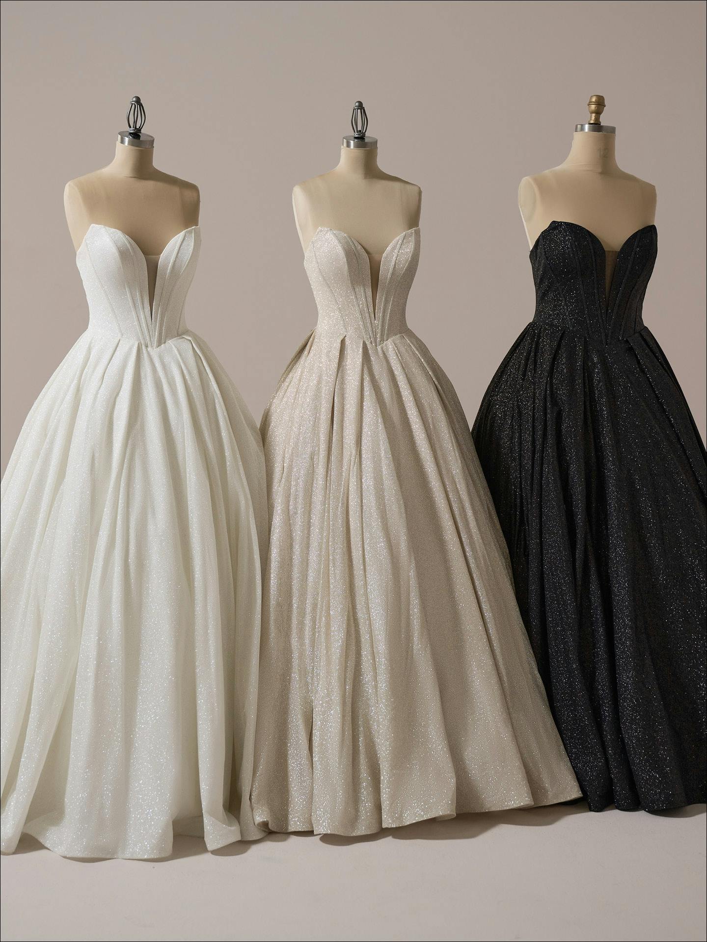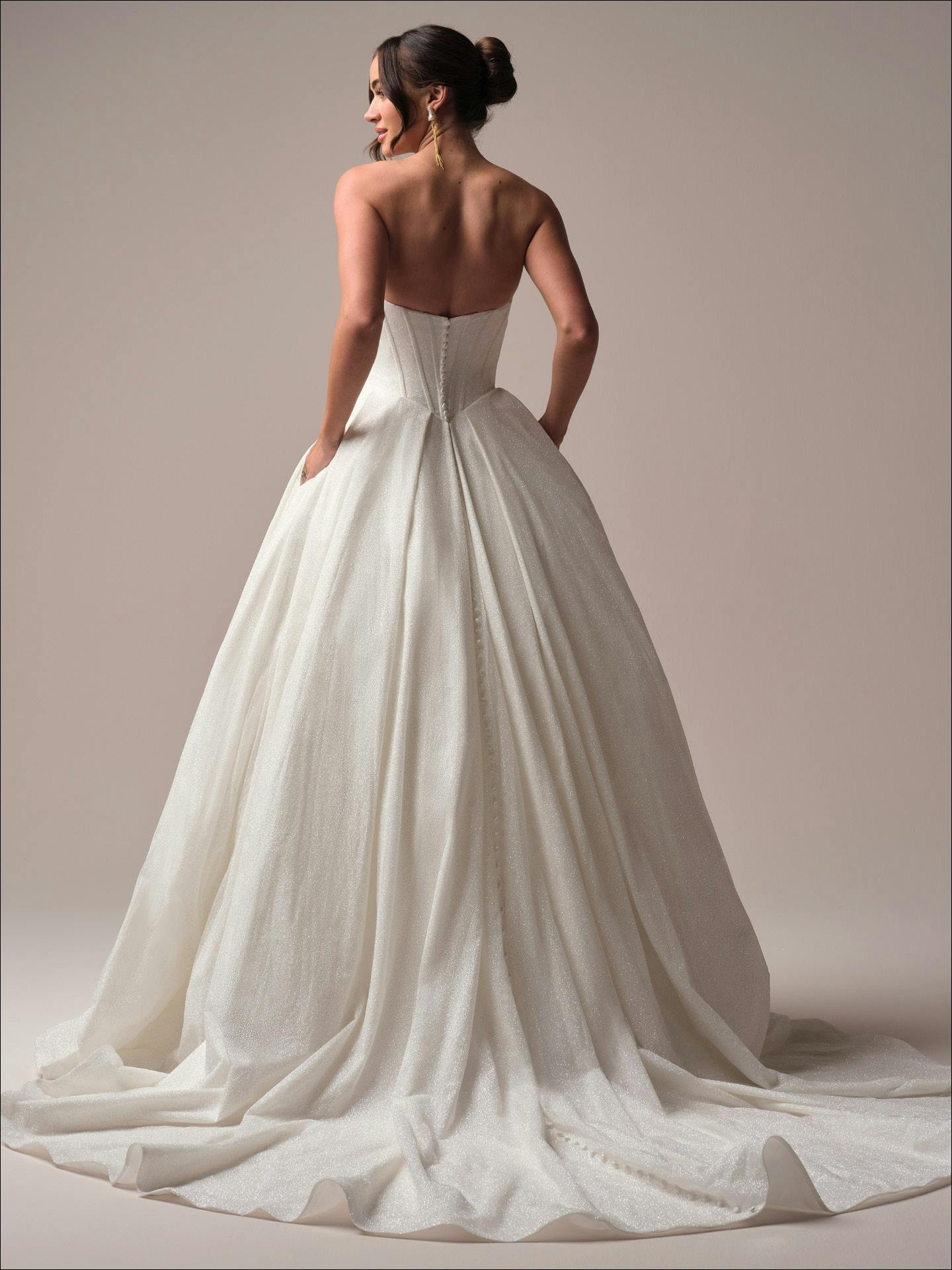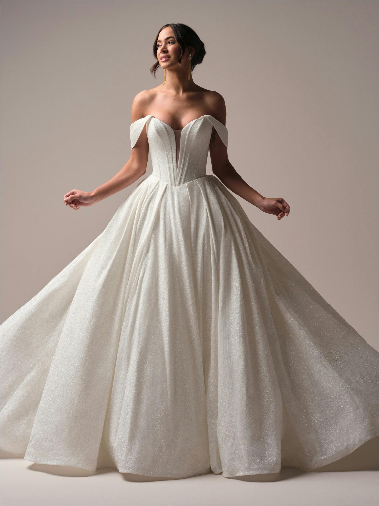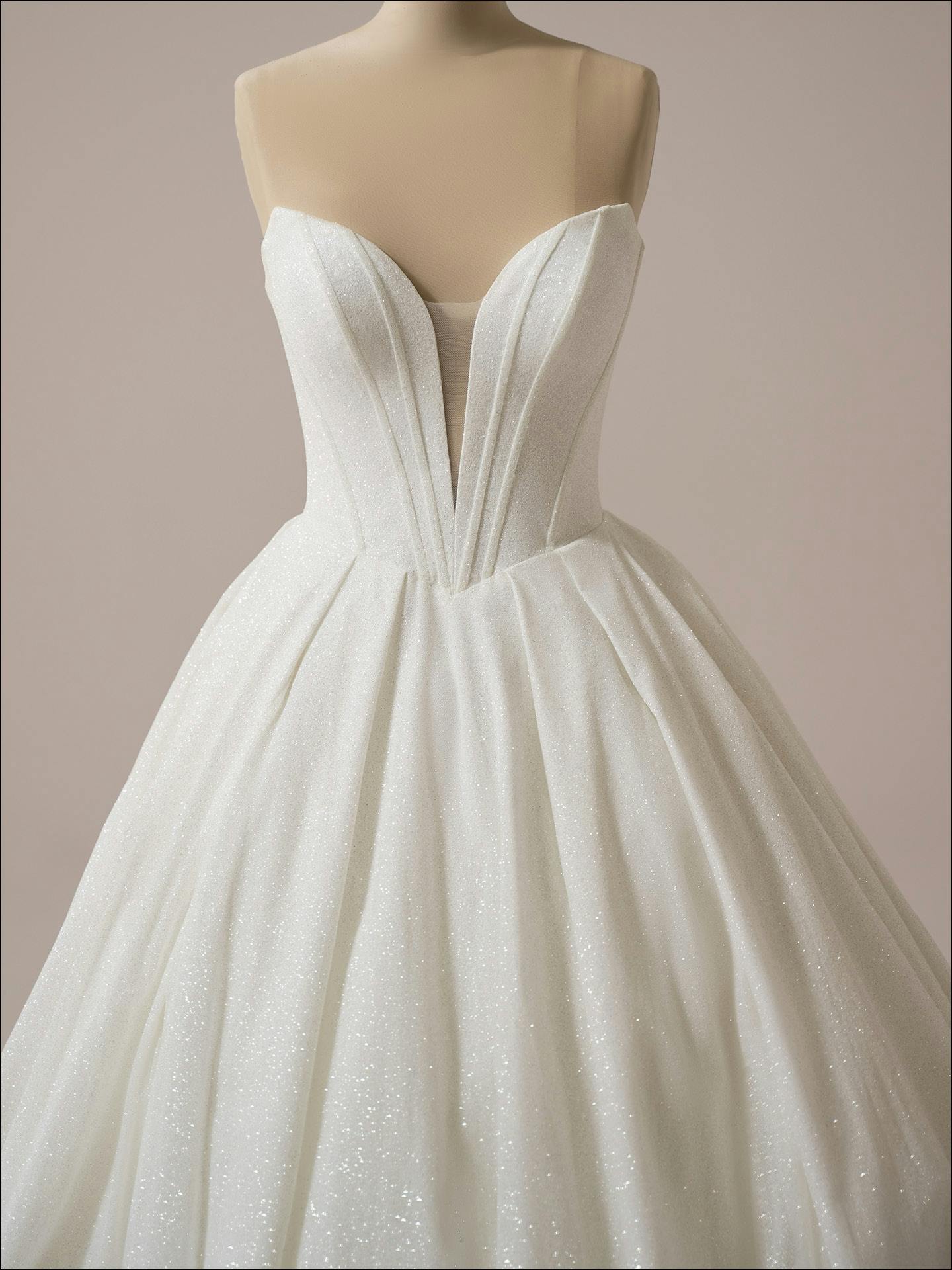 Regal-chic style starts with a princess silhouette and luxe fabric. This sparkly plunge neck ballgown wedding dress has both those bases covered — and more.