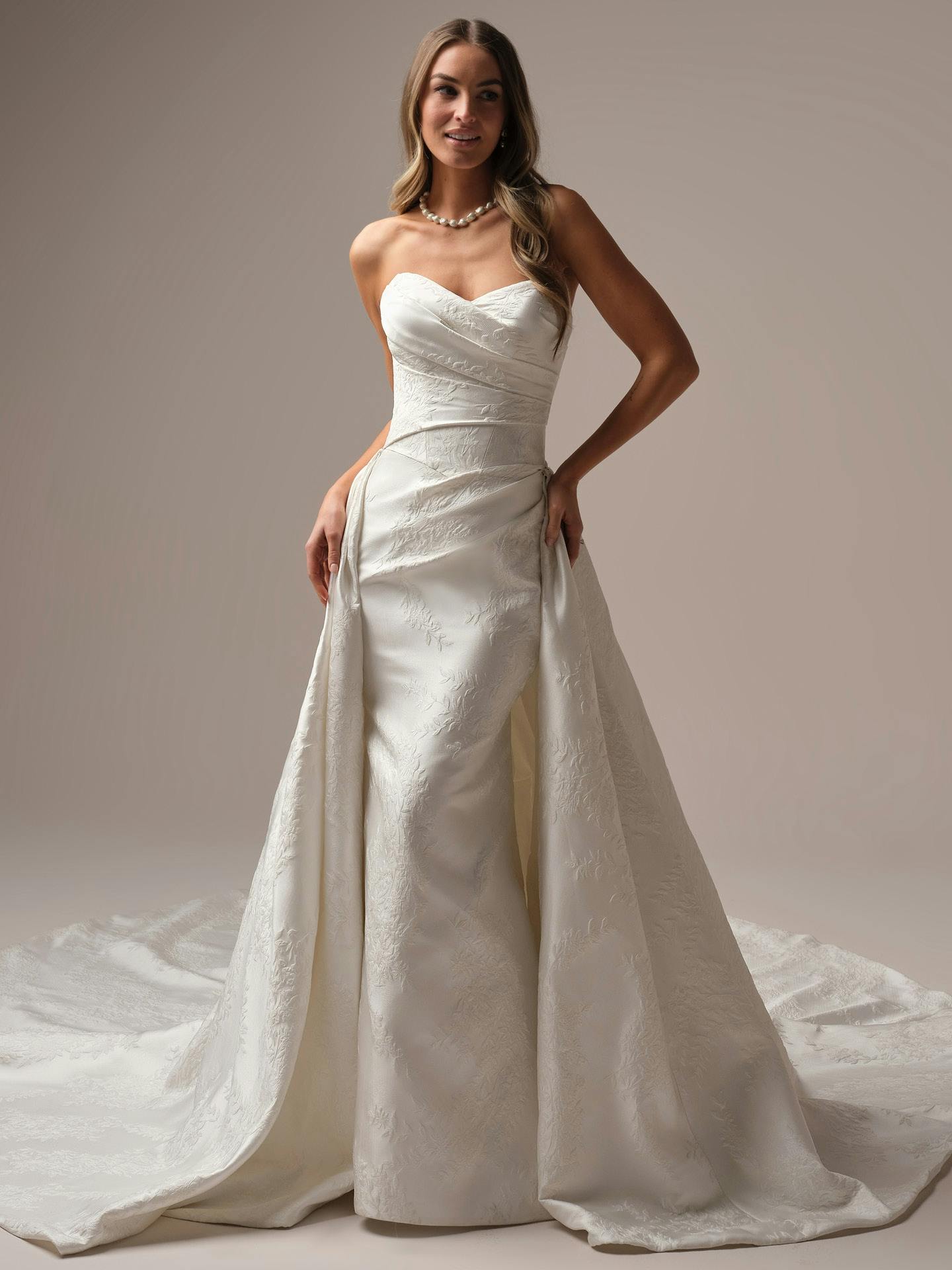 Flattering asymmetrical floral jacquard mermaid bridal gown