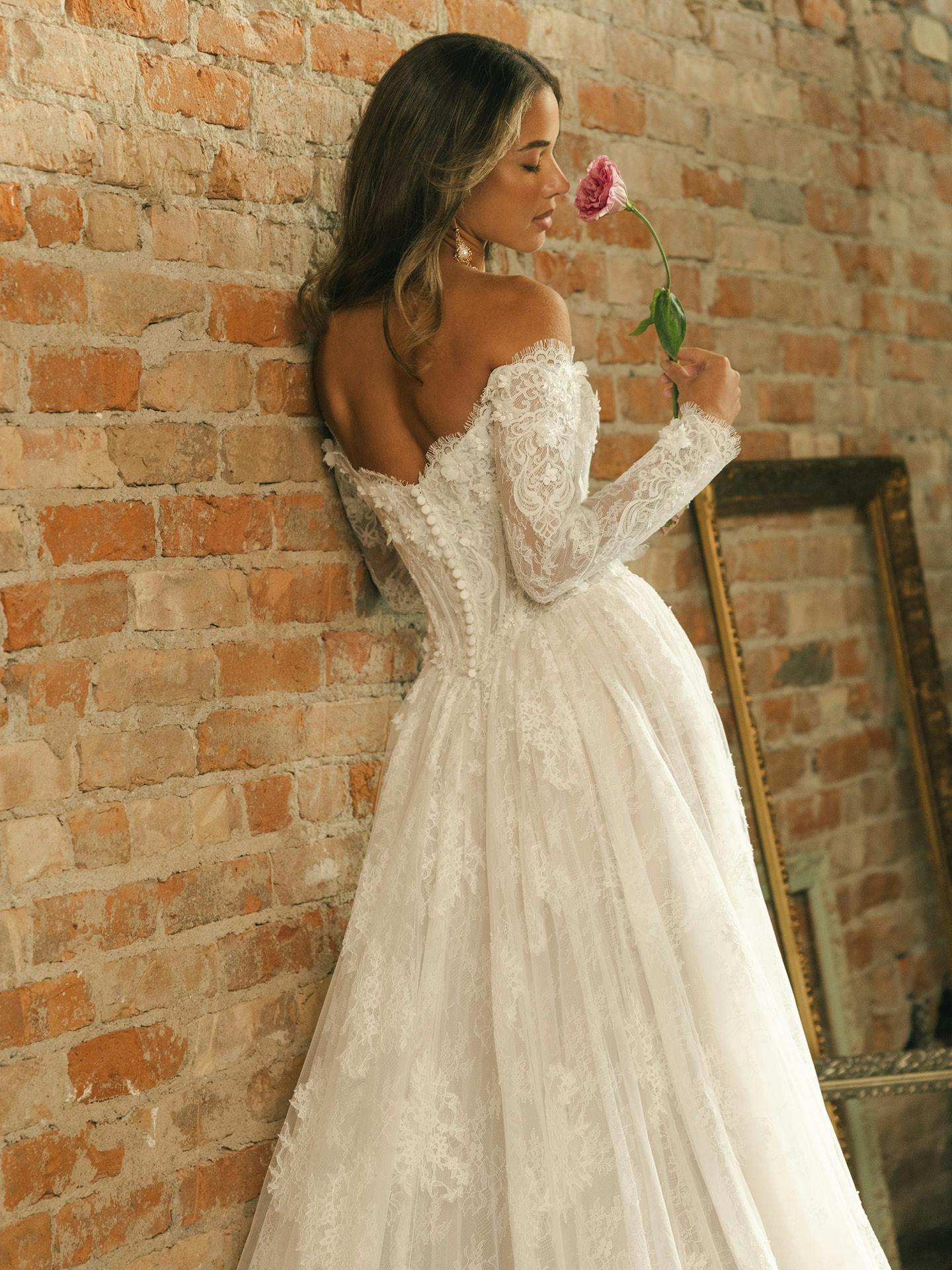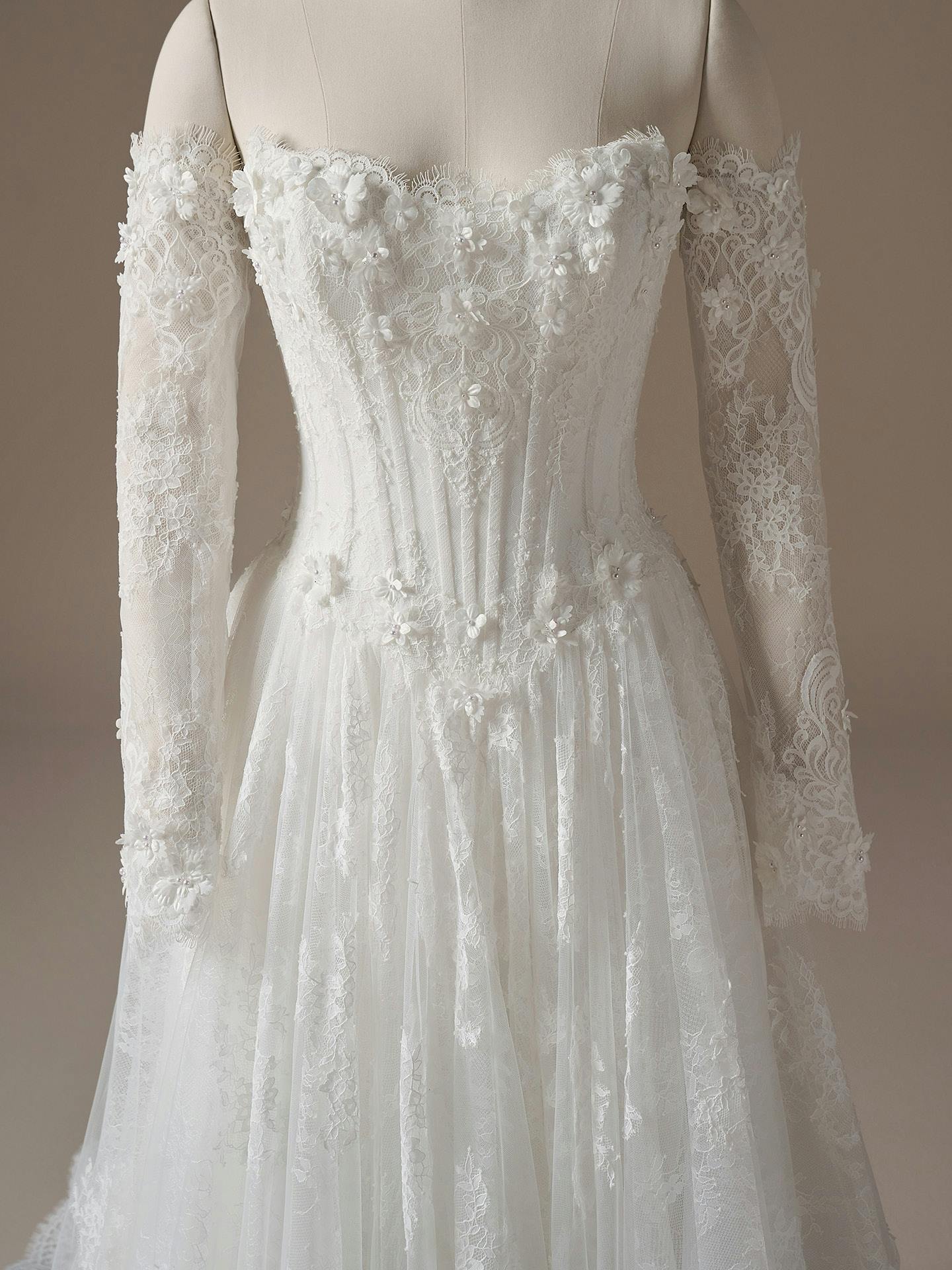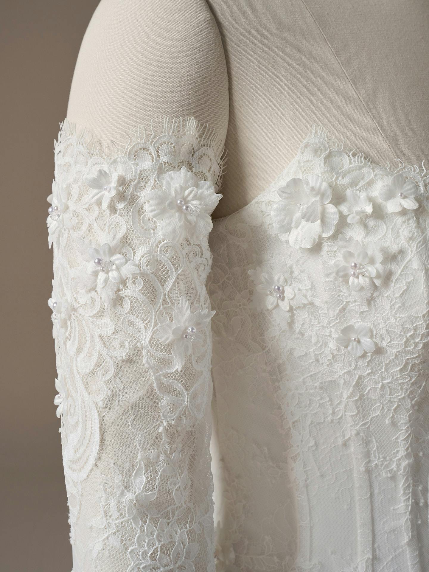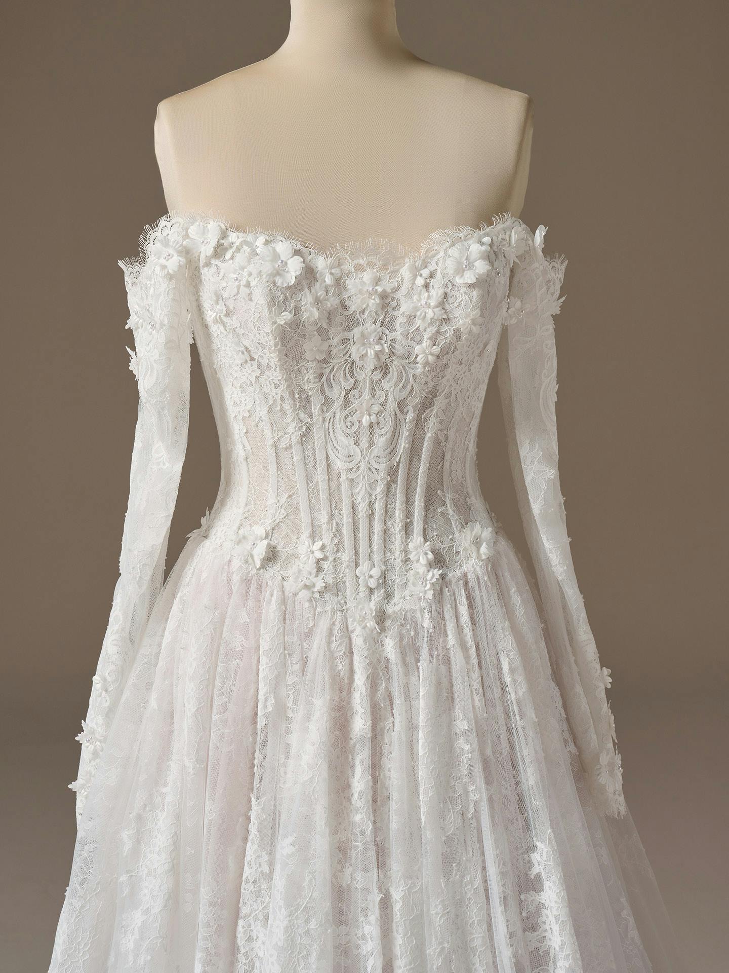 Kitaro flowing off-the-shoulder 3-D flower lace ballgown wedding dress