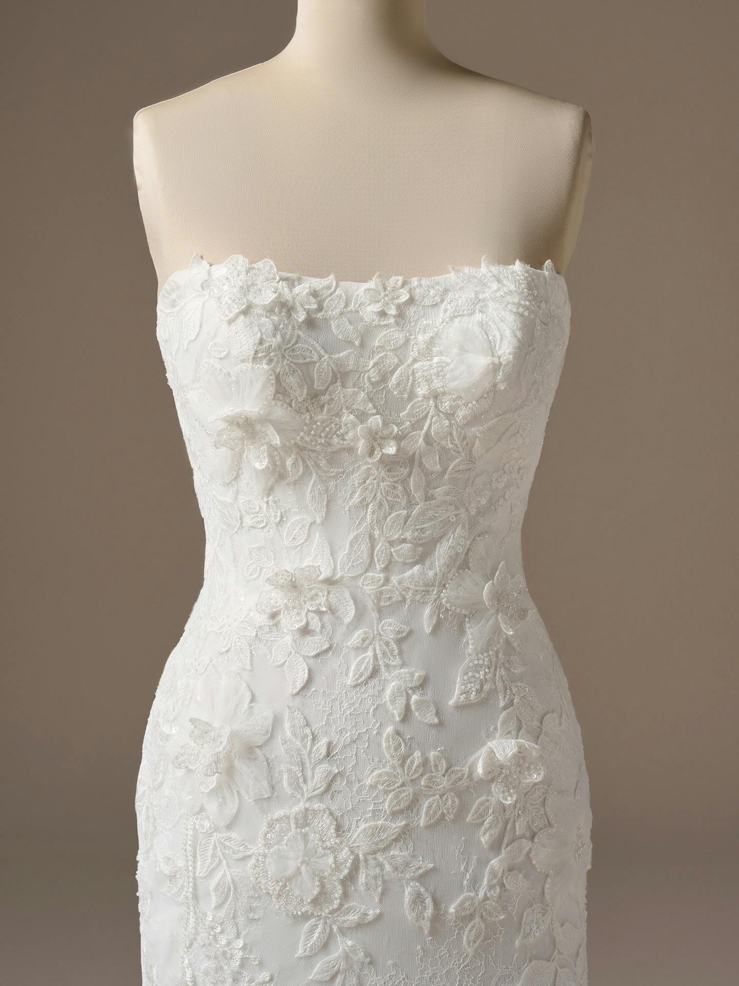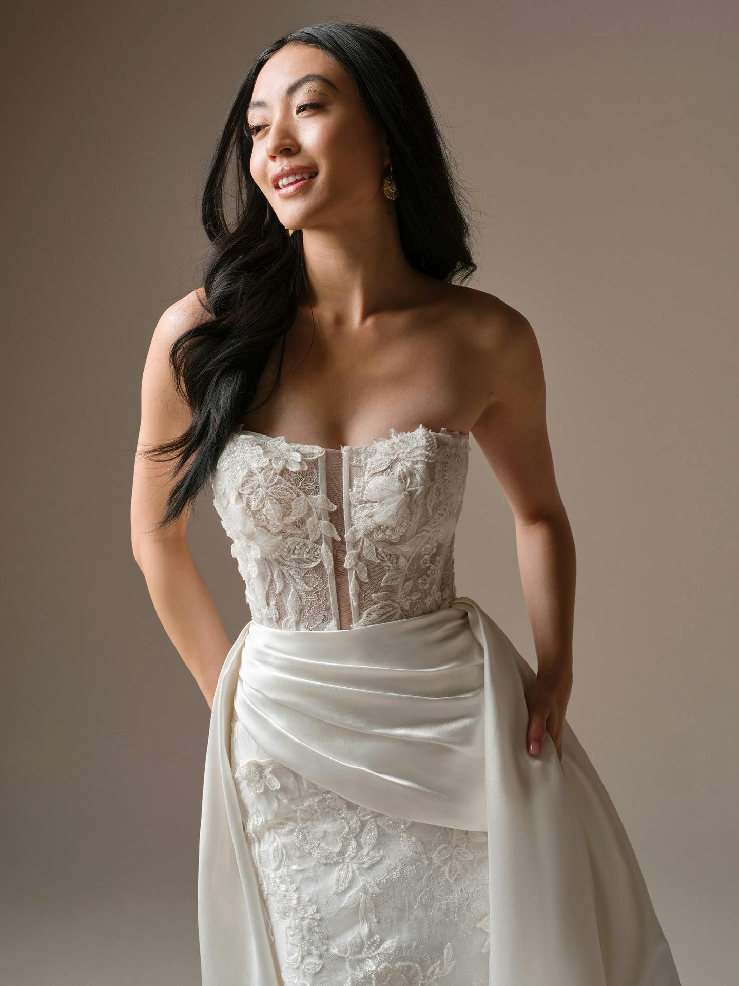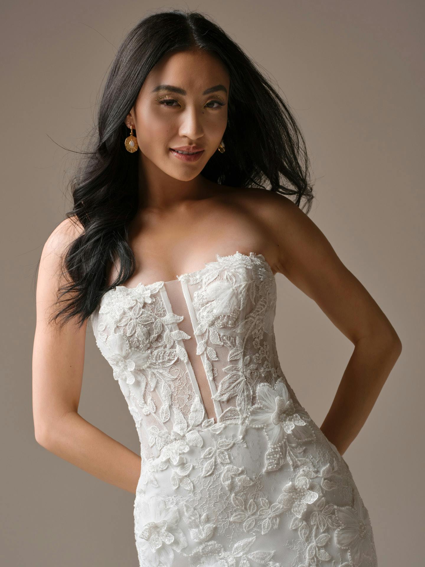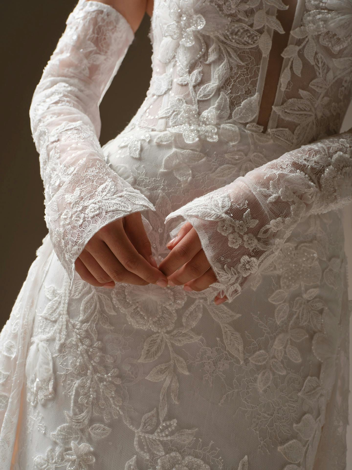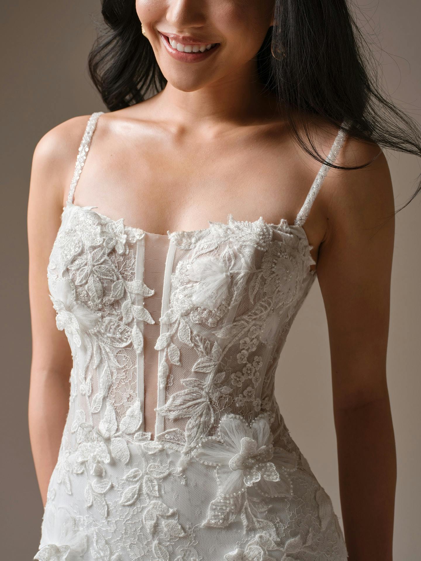 You’re bold. You’ve got a vibe. You’re destined for a plunging illusion square neckline 3-D floral wedding dress made for celestial backdrops and magical lighting.