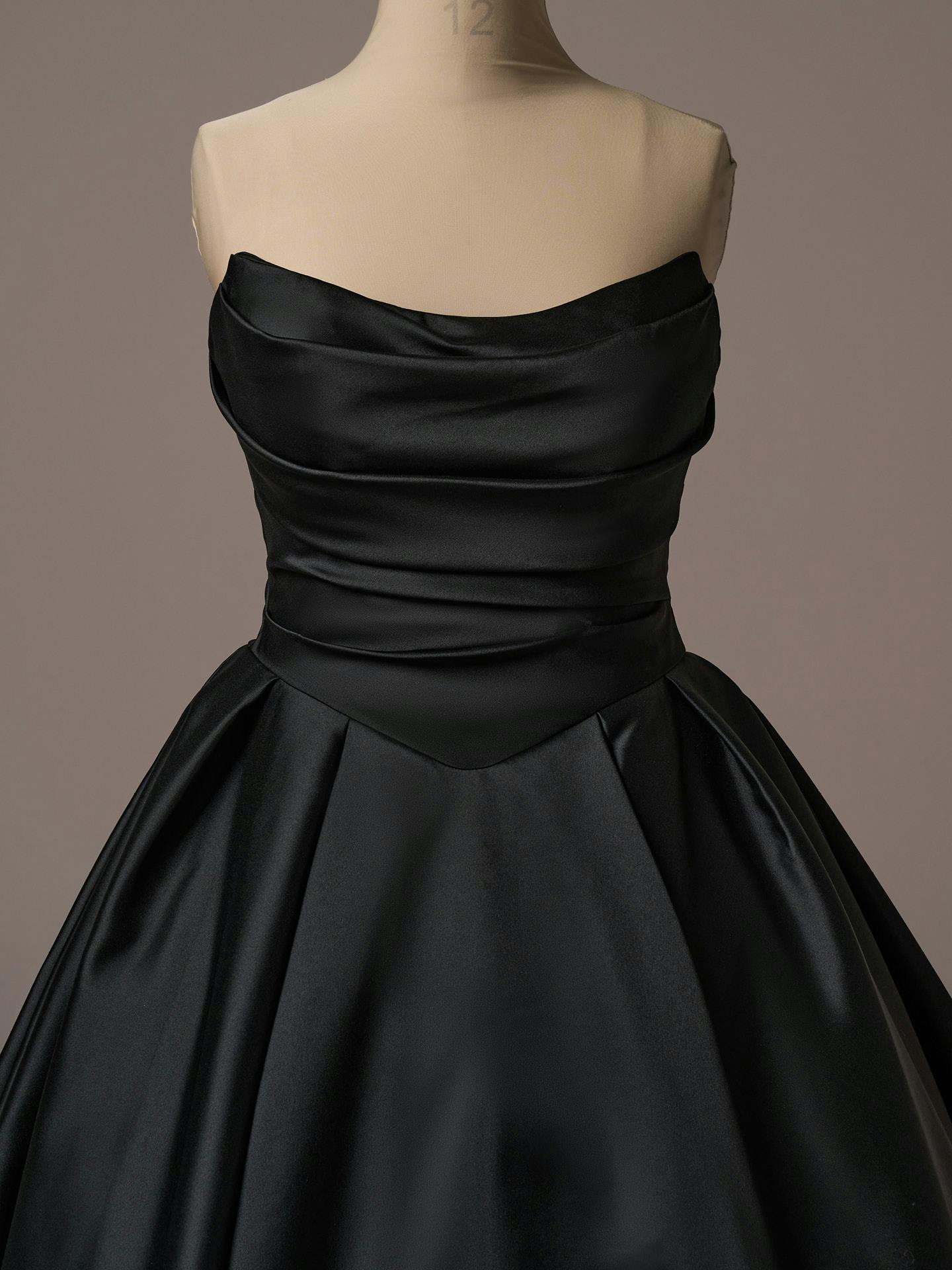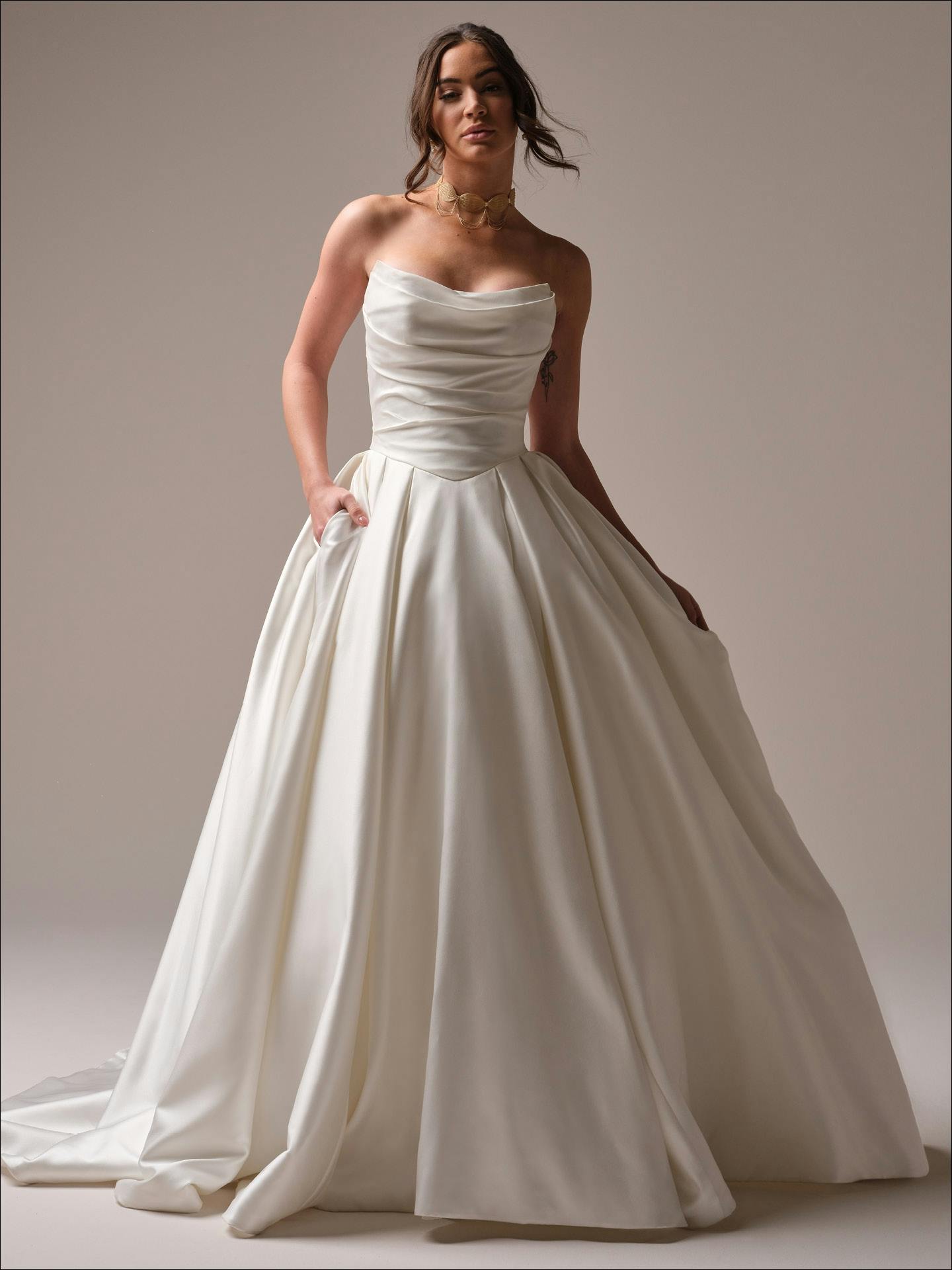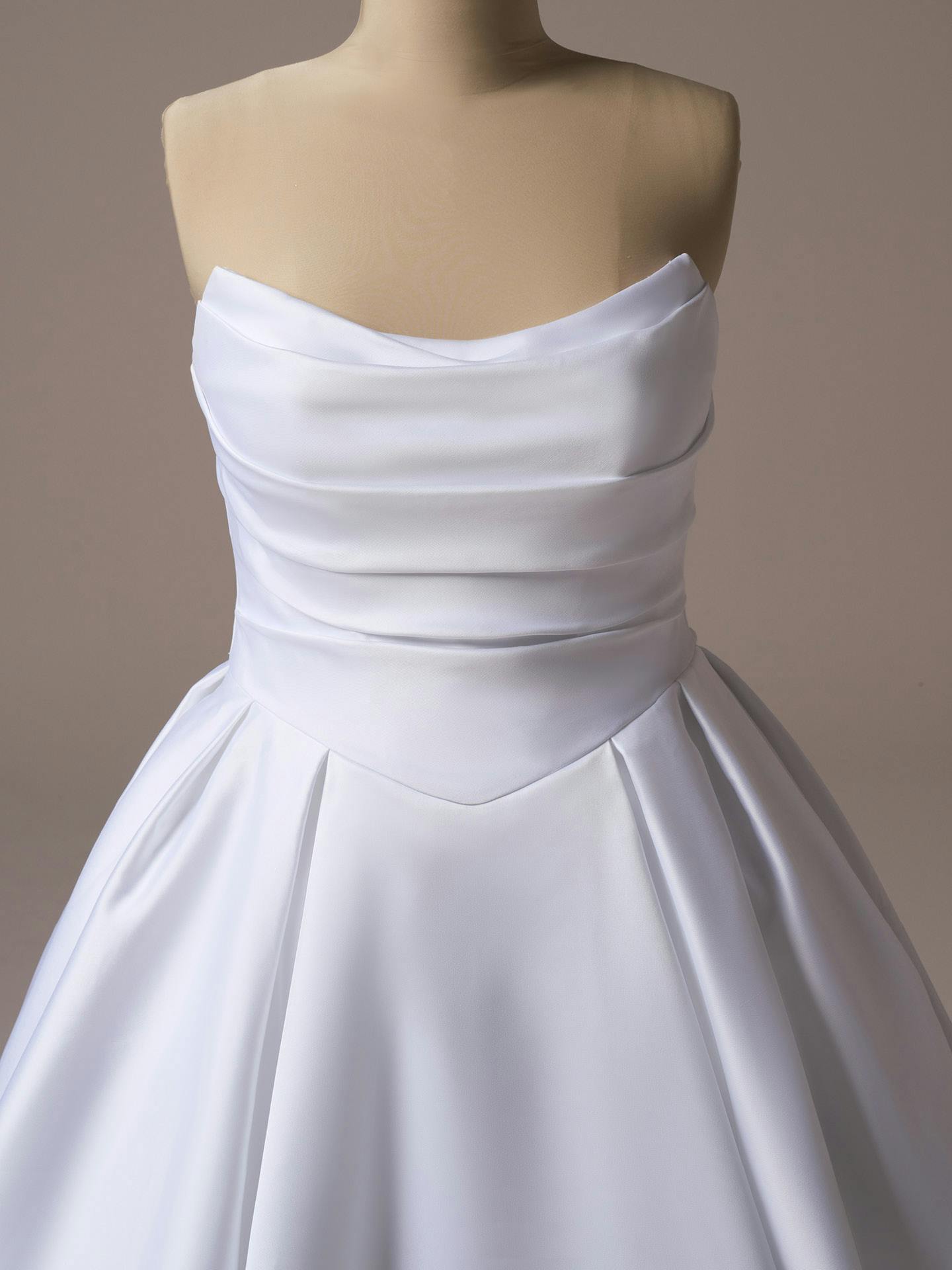 Presenting tailored satin and exquisite draping for an exceptionally couture statement. This classic satin ruched ballgown wedding gown is made to delight from every angle.