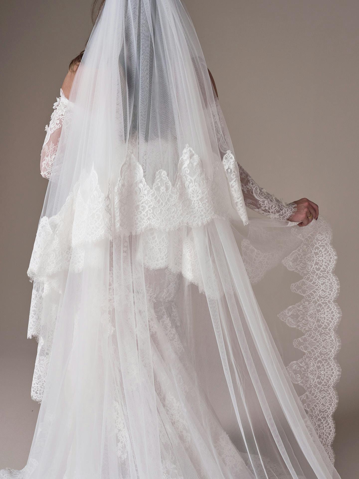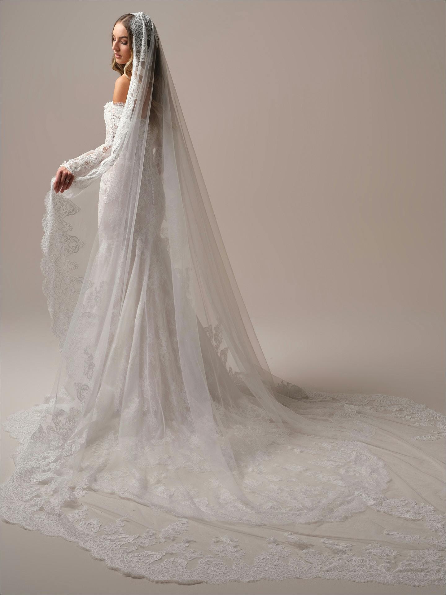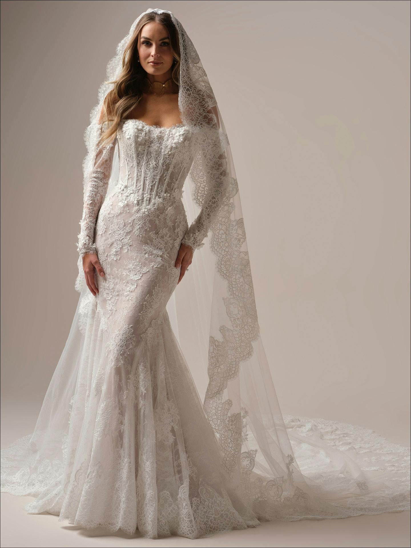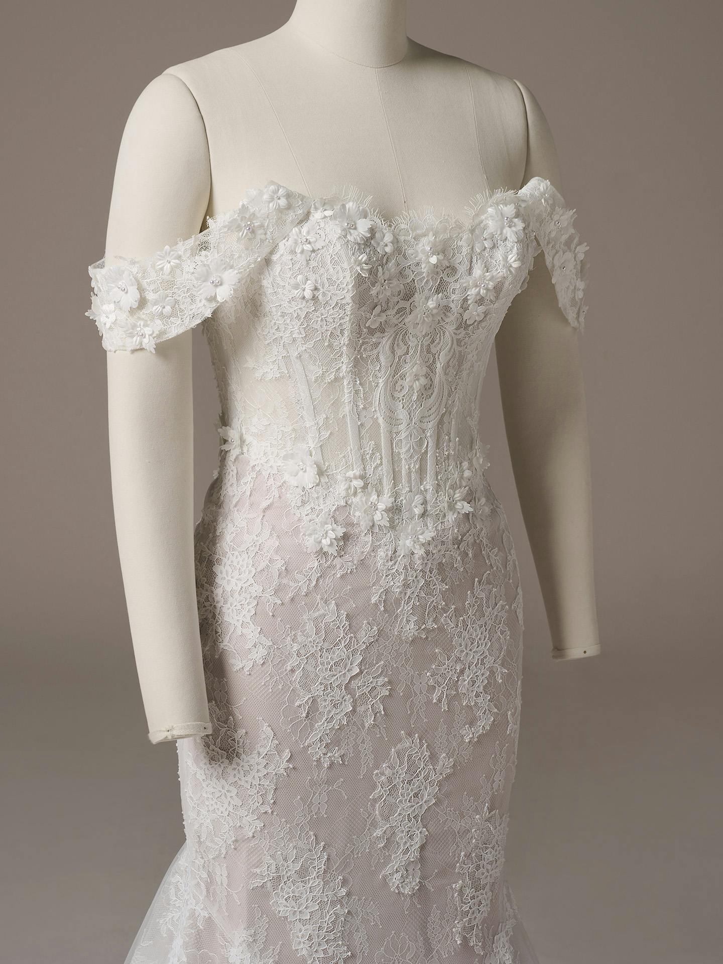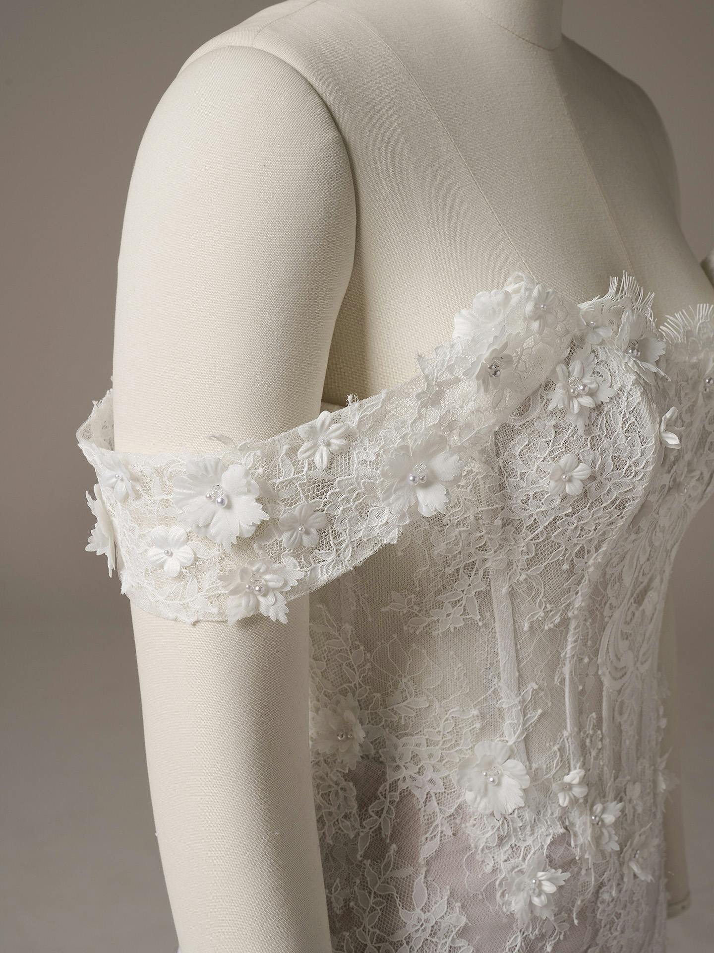 Featuring lush illusion, bloom-like motifs, and boudoir-inspired embellishments, this 3-D floral lace mermaid wedding dress is a true show-stopper.