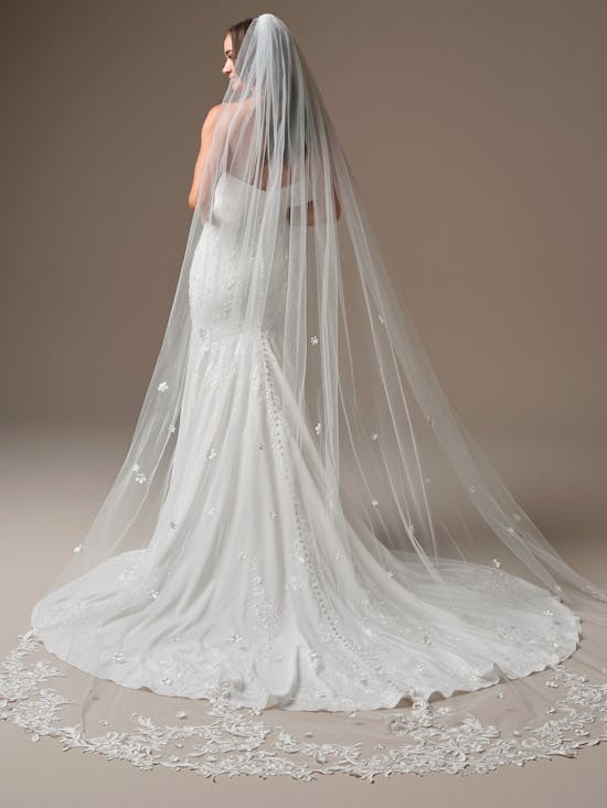 Thera refined fit-and-flare cat eye neckline sequin lace wedding dress