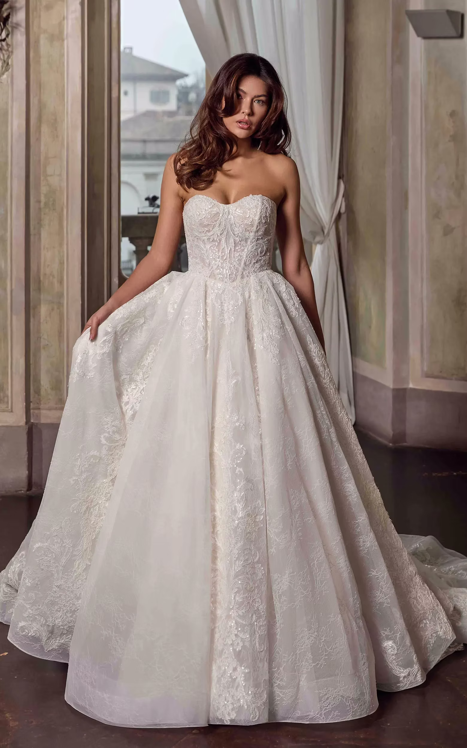 Ballgown with ivory corded lace and sequins over Chantilly lace, ivory tulle, dust matte lining, basque waist champagne unlined bodice, buttons to end of train.