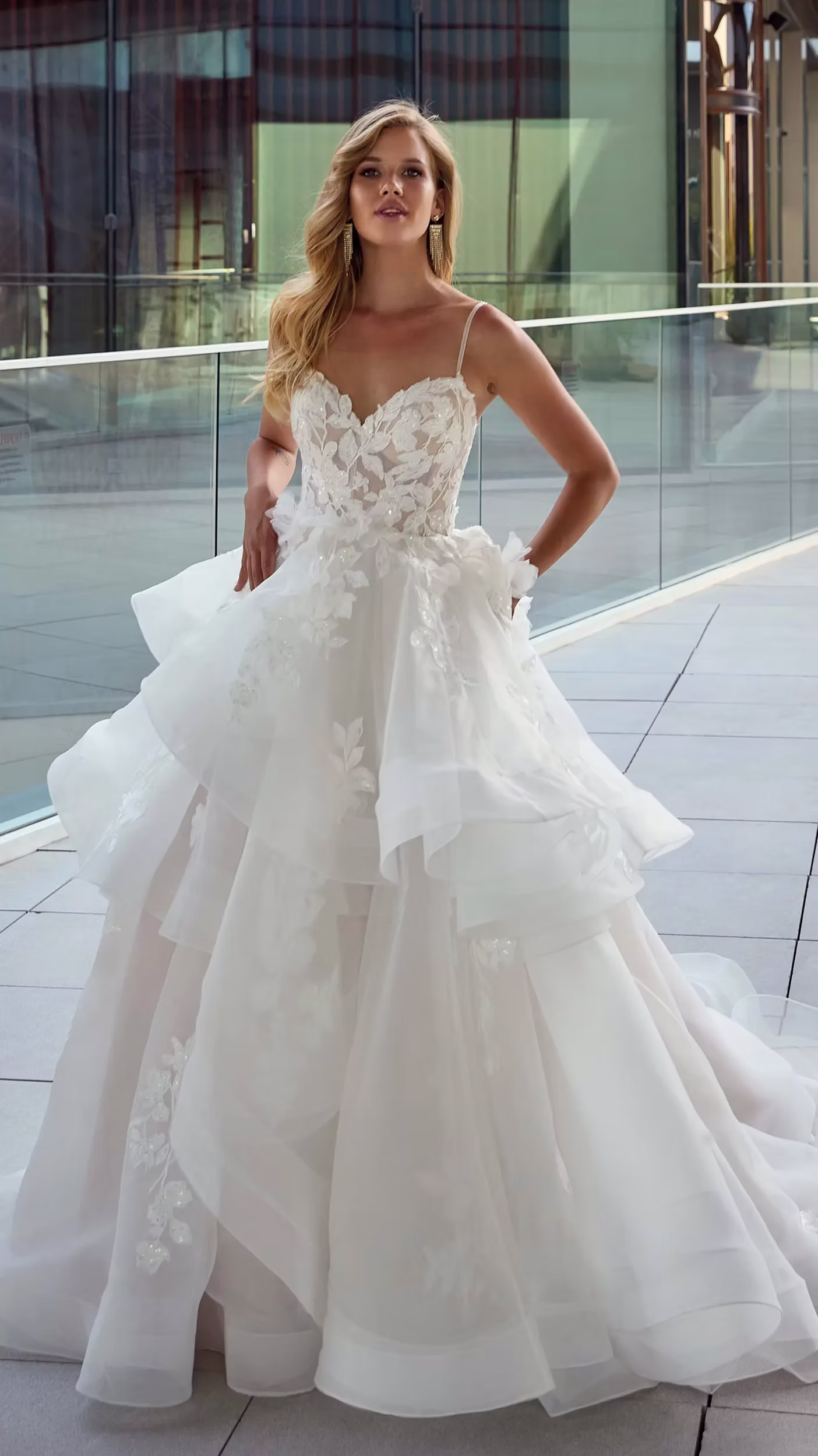 Ballgown in ivory organza with handkerchief skirt, ivory lace with sequins and 3D organza appliqués, lavender matte lining, lavender and ivory tulle unlined bodice, tulle spaghetti straps.